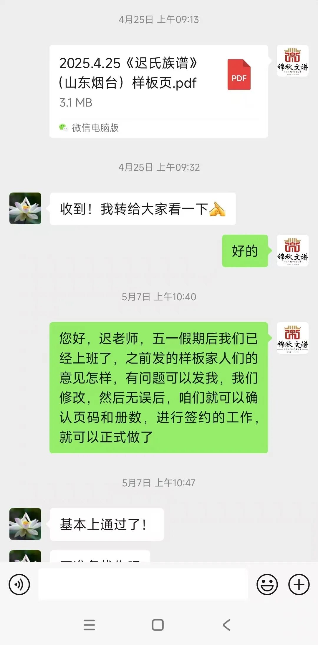 早在2021年10月,迟氏家族便与锦秋文谱家谱馆有过联系,那时的交流如同埋下的一颗种子。时隔三年,迟老师再次联系上了锦秋文谱家谱馆的王编辑,这一联系,让族谱编印的梦想重新焕发生机。三年间,迟氏家族全力以赴,四处奔走,收集整理家族资料,每一份资料都凝聚着家族成员的心血与对家族历史的敬重。经过不懈努力,家族资料终于整理得差不多了,这也为后续的族谱编印奠定了坚实基础。